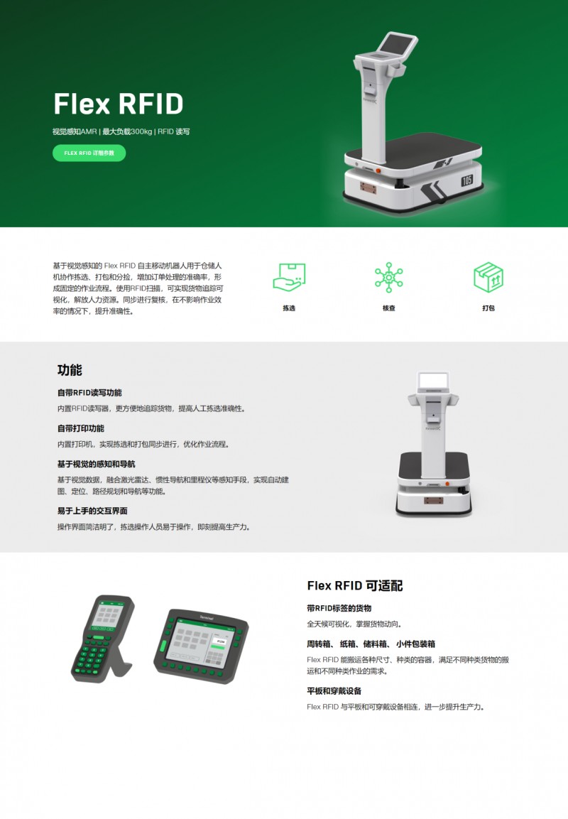 基于視覺感知的 Flex RFID 自主移動(dòng)機(jī)器人用于倉(cāng)儲(chǔ)人機(jī)協(xié)作揀選、打包和分撿,增加訂單處理的準(zhǔn)確率,形成固定的作業(yè)流程。使用RFID掃描,可實(shí)現(xiàn)貨物追蹤可視化,解放人力資源。同步進(jìn)行復(fù)核,在不影響作業(yè)效率的情況下,提升準(zhǔn)確性。