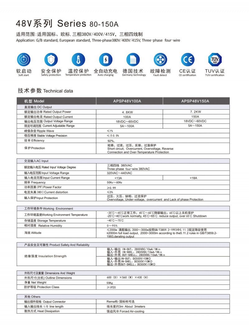 觸摸屏智能操作設(shè)計(jì):告別傳統(tǒng)按鍵方式,給您帶來更現(xiàn)代更具科技智能的操作體驗(yàn) 自動(dòng)充電:插槍自動(dòng)充電,簡(jiǎn)化充電流程,便于操作 兼容性高:80V200A兼容48V200A充電 多重保護(hù): 輸出短路,過流過壓保護(hù),反接保護(hù),電流導(dǎo)管保護(hù)等多重保護(hù) 預(yù)約充電功能:避開高峰用電時(shí)段,有效節(jié)省成本 雙語切換:中英文雙語隨需切換,跨越語言障礙,與世界接軌 人性化設(shè)計(jì):充電機(jī)背板內(nèi)部附部件明細(xì)及產(chǎn)品接線圖,方便客戶可更清楚的了解產(chǎn)品,便于維修,提高售后時(shí)效 獨(dú)特設(shè)計(jì): 內(nèi)置電磁鎖驅(qū)動(dòng)模塊,防止臨時(shí)斷電鎖槍 使用壽命更長(zhǎng):功率模塊預(yù)留20%空間,提高模塊的使用壽命 出色內(nèi)部結(jié)構(gòu): 內(nèi)部結(jié)構(gòu)左右出風(fēng),內(nèi)部電路不容易積粉塵,提高充電機(jī)壽命