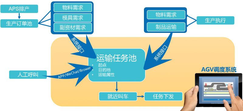 用AGV調度系統(tǒng)(VConn)完成物料計劃下發(fā),現場叫料之間的系統(tǒng)閉環(huán),考慮到異常送料需求,系統(tǒng)保留人工呼叫接口,可以快速與第三方系統(tǒng)或設備對接