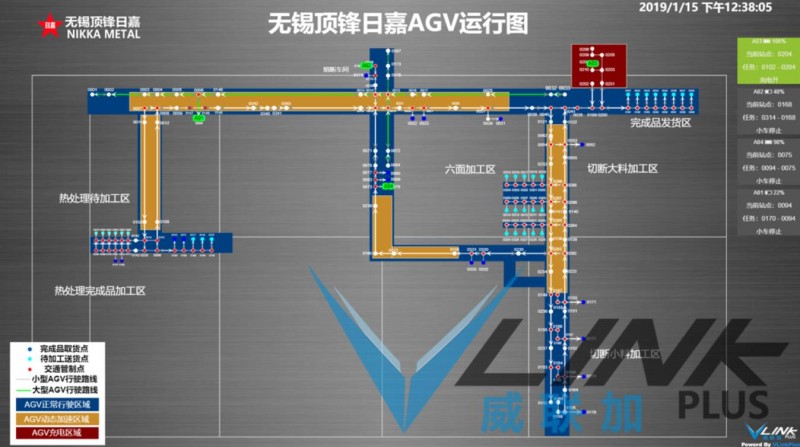 無錫頂鋒日嘉為提高物料和在制品的流轉(zhuǎn)速度,要求物料及在制品的運輸全面采用AGV調(diào)度系統(tǒng)自動運輸。通過威聯(lián)加AGV智能調(diào)度系統(tǒng)的實施,實現(xiàn)AGV運輸?shù)撵`活調(diào)度和線路優(yōu)化,大幅度提升物流的效率,實現(xiàn)快速精準(zhǔn)運輸。路線設(shè)計根據(jù)現(xiàn)場狀況設(shè)計3種類型的行駛路線:AGV正常行駛區(qū)域、AGV動態(tài)加速區(qū)域、AGV充電區(qū)域,在行駛的路線上通過各節(jié)點的不同功能指導(dǎo)小車的行駛路線。