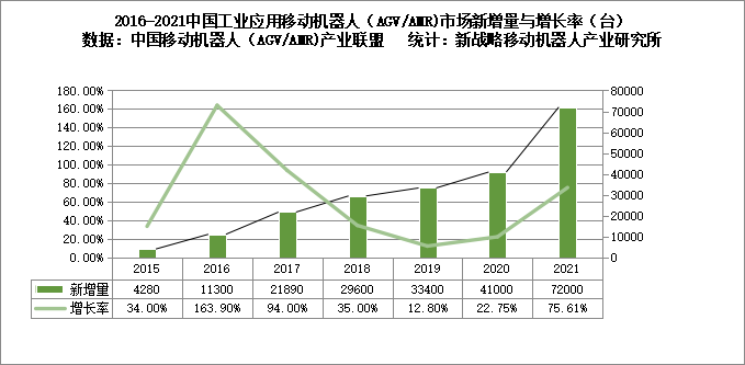 圖表:2015-2021中國市場企業工業應用移動機器人(AGV/AMR)新增量(臺)與增長率