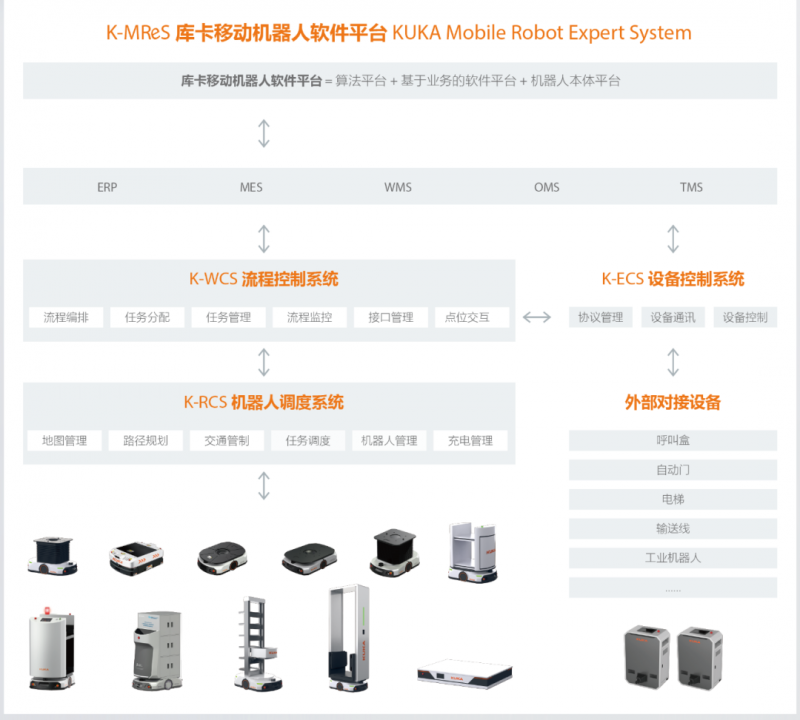 K-MR圖片S軟件平臺包含K-WCS(流程控制系統)、K-RCS(機器人調度系統)和K-ECS(設備控制系統)三大模塊,可無縫對接上層系統,數據信息獲取,任務流程編排、多機器人調度協同、外部設備對接調度等功能,實現工廠制造的自動化、智能化和數字化。