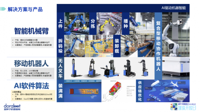 上件機器人DoraInductor、分揀機器人DoraSorter、包裝機器人DoraPacker、復(fù)合型移動協(xié)作機器人DoraMOMA等智能機器人齊上陣,讓人眼前一亮。值得一提的是,藍(lán)胖子裝載機器人DoraLoader也在媒體開放日上首度曝光,將在不久的未來落地實際應(yīng)用。