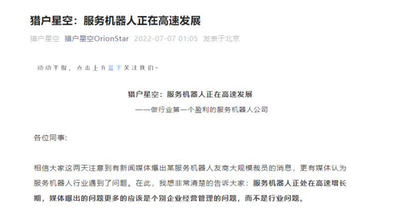 7月7日凌晨,獵戶星空在其官方公眾號(hào)上發(fā)文稱:服務(wù)機(jī)器人正處在高速增長(zhǎng)期,媒體曝出的問題更多的應(yīng)該是個(gè)別企業(yè)經(jīng)營(yíng)管理的問題,而不是行業(yè)問題。
