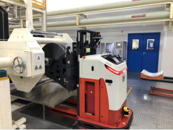 其次,針對極卷搬運及上下料的中段工藝應用場景,佳順智能開發(fā)了兩款采用激光SLAM導航的專用單叉/雙叉臂舉升AGV,最大負載可達1.8T,結合激光測距和二維碼技術進行精確定位,擁有360°避障雷達、急停按鈕、機械防撞機構、聲光報警等多種避障功能,實現(xiàn)生產(chǎn)安全、穩(wěn)定運行。