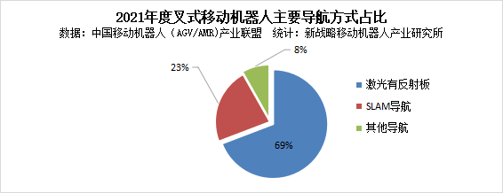 從產品類別分布看,2021年,激光有反射板叉車依舊是市場應用主流,占比為69%,其次是SLAM導航無人叉車,在一些對機器人柔性化程度要求高的場景中逐漸滲透,占比為23%。