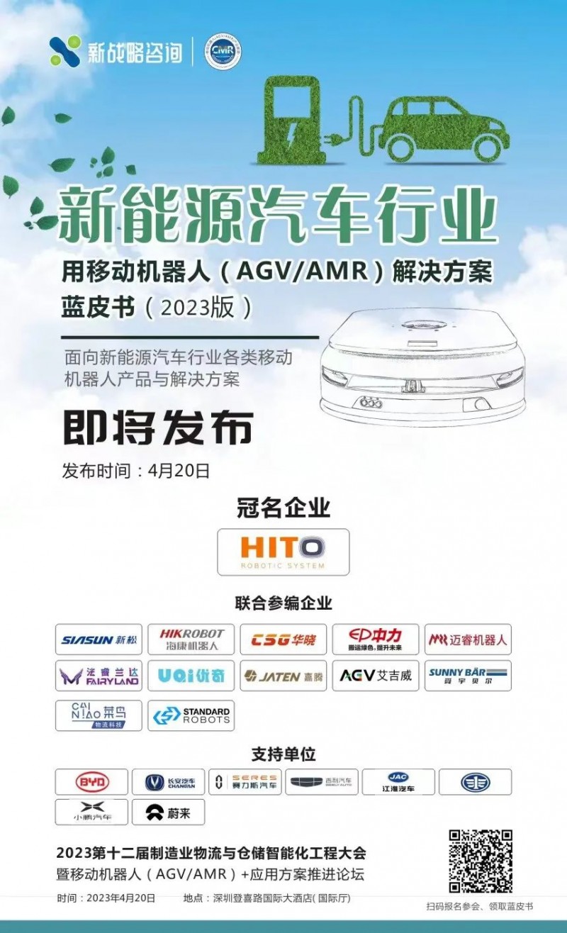 4月20日在“2023第十二屆制造業物流與倉儲智能化工程大會”上《新能源汽車行業用移動機器人(AGV/AMR)解決方案藍皮書(2023版)》將正式發布!