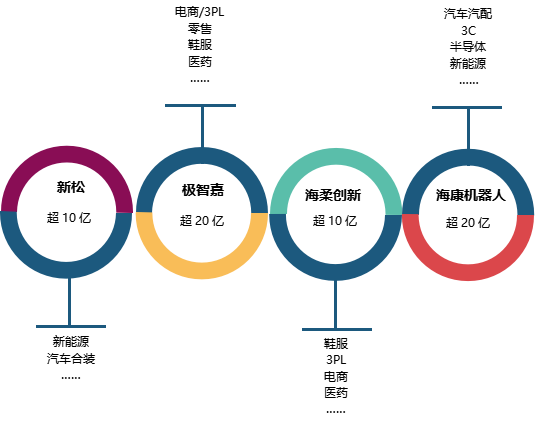 AGV/AMR)市場(chǎng)呈現(xiàn)出高速增長,在一些細(xì)分與創(chuàng)新領(lǐng)域應(yīng)用超過預(yù)判。其中,部分創(chuàng)新型企業(yè)及品類專長的企業(yè)發(fā)展勢(shì)頭驚人,增長幅度呈現(xiàn)單倍或多倍增長。2022年中國工業(yè)應(yīng)用移動(dòng)機(jī)器人市場(chǎng)有四家企業(yè)業(yè)務(wù)訂單額跨過了十億門檻。分別是新松機(jī)器人、極智嘉、海康機(jī)器人以及海柔創(chuàng)新。
