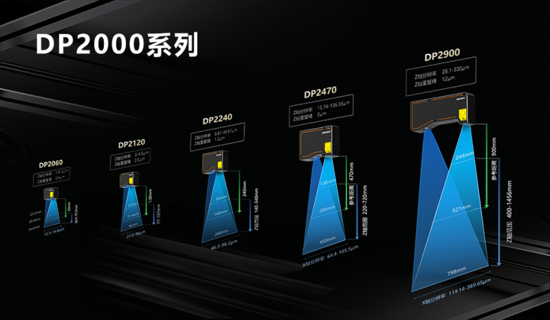海康機器人3D激光輪廓傳感器目前已發(fā)布DP2000和DP3000兩大系列。其中DP2000推出五款型號,單輪廓點數(shù)為2048點,最高采集頻率達到10KHz,X軸測量范圍25.2-720mm,Z軸重復精度0.4-24um,線性度±0.01% of MR,且DP2240和DP2470支持紅藍光兩個版本選配。