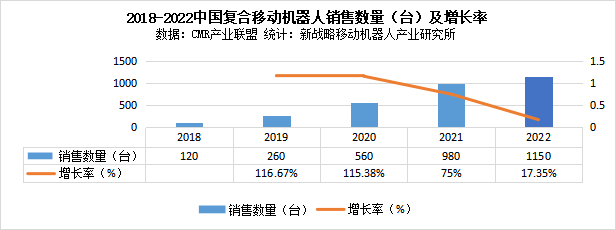根據(jù)CMR產(chǎn)業(yè)聯(lián)盟數(shù)據(jù),新戰(zhàn)略移動機(jī)器人產(chǎn)業(yè)研究所統(tǒng)計, 2022年度中國市場新增復(fù)合移動機(jī)器人1150臺,從2018年的120臺到2022超千臺,近年來復(fù)合機(jī)器人落地應(yīng)用逐漸增多。