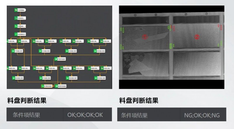 針對搭邊缺陷檢測,基于相機采集的深度圖像,導入VM 3D軟件中,依據(jù)mark點定位到每個料盤的四個角點,分別在角點料坑上下曲小區(qū)域計算均值,可取四對或八對區(qū)域,比對料坑上下高度差值,正值為OK(綠色非搭邊框),負值為NG(紅色搭邊框)。