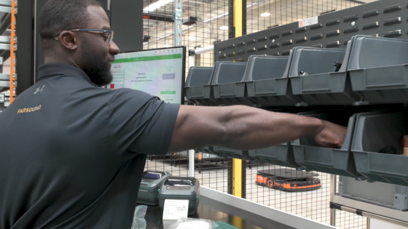 Farsound倉庫投入使用 “貨到人” 解決方案,布置了650個可移動貨架和8個揀選站。同時,設(shè)置指示燈和PTL分撥墻引導員工作業(yè),確保揀選、投放準確。該方案釋放了32,000個料箱的額外存儲空間,提升了場地空間利用率。