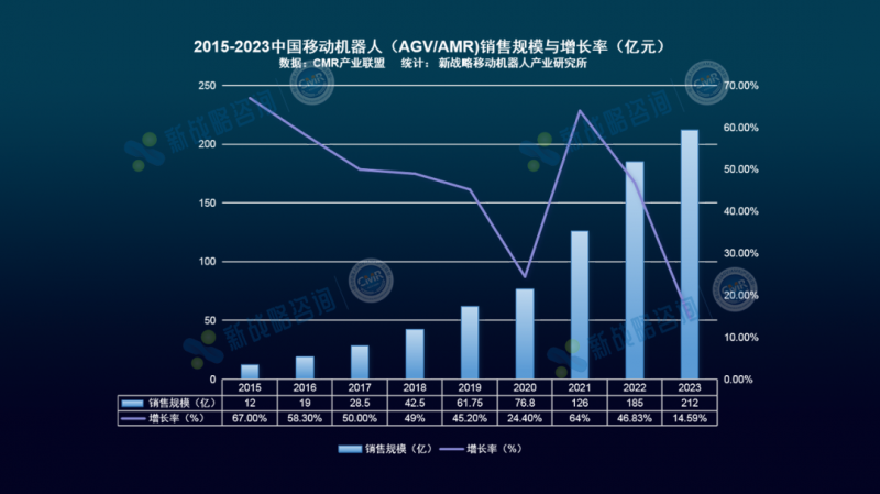 圖表:2015-2023中國(guó)工業(yè)應(yīng)用移動(dòng)機(jī)器人(AGV/AMR)銷(xiāo)售規(guī)模與增長(zhǎng)率