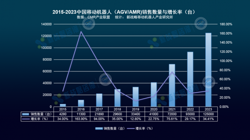 根據(jù)CMR產(chǎn)業(yè)聯(lián)盟數(shù)據(jù),新戰(zhàn)略移動(dòng)機(jī)器人產(chǎn)業(yè)研究所統(tǒng)計(jì),從2015年至2023年,中國(guó)市場(chǎng)移動(dòng)機(jī)器人(AGV/AMR)產(chǎn)業(yè)年復(fù)合增長(zhǎng)率達(dá)43.18% ;2023年中國(guó)移動(dòng)機(jī)器人(AGV/AMR)銷(xiāo)售規(guī)模約為212億,同比增長(zhǎng)14.59%;銷(xiāo)售數(shù)量約為125000臺(tái),同比增長(zhǎng)34.41%。