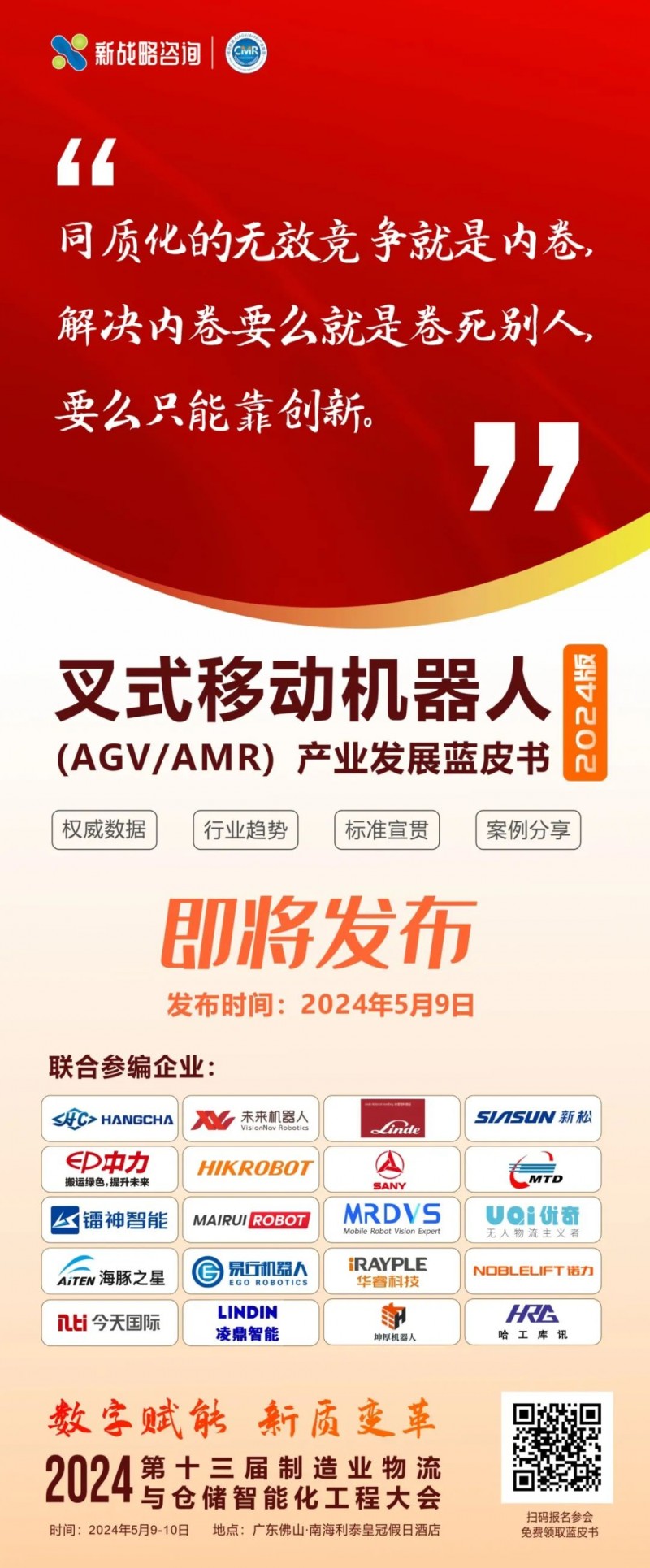 2024年,為了更好地探析當前無人叉車市場最新發展情況及趨勢,推動無人叉車深入應用,彰顯行業品牌力量,由CMR產業聯盟主編,杭叉智能、未來機器人、林德、新松、浙江中力、海康機器人、三一機器人、機科股份、鐳神智能、邁睿機器人、邁爾微視、UQI優奇、海豚之星、易行機器人、華睿科技、上海諾力智能、今天國際、凌鼎智能、坤厚智能、哈工庫訊等20家無人叉車主流企業聯合編制的《叉式移動機器人(AGV/AMR)產業發展藍皮書(2024版)》將在5月9日舉辦的“inktype="text" imgurl="" imgdata="null" data-itemshowtype="0" tab="innerlink" data-linktype="2" hasload="1">第十三屆制造業物流與倉儲智能化工程大會暨第二屆全球叉式移動機器人峰會”上正式發布,參會人員可現場領取藍皮書紙質版一份,敬請期待!