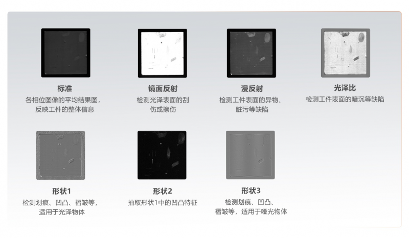 傳統(tǒng)檢測(cè)方案往往需要針對(duì)不同缺陷定制專用設(shè)備,不僅成本高昂,而且標(biāo)準(zhǔn)化程度低。而2.5D視覺(jué)技術(shù)則大為不同,它僅需單個(gè)光源就能同時(shí)檢測(cè)多種類型的缺陷,且不受角度限制,這大大提升了方案的通用性和效率。更重要的是,一次拍攝就能輸出多類型的結(jié)果圖,從細(xì)小的凹凸到復(fù)雜的劃痕,再到微小的臟污,展現(xiàn)了強(qiáng)大的復(fù)合檢測(cè)功能。