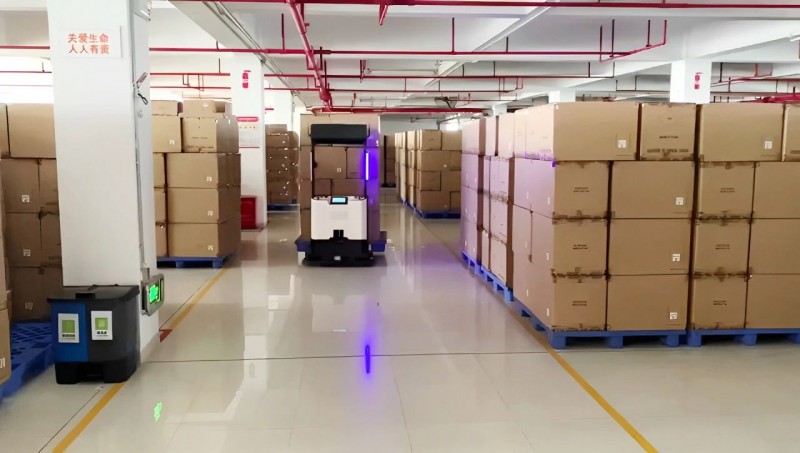 某華南成衣制造企業(yè),其倉庫為典型的地堆式,擁有超過4000個庫位,且?guī)煳婚g距小、物料變動大,無法使用2D激光導航,最終采用邁爾微視頂視SLAM導航解決方案,將導航模塊安裝于AGV叉車頂部,負責運輸托盤。