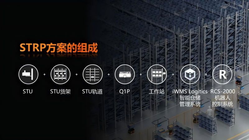 STRP方案核心的由STU+高位貨架+緩存位+Q1P+工作站構成,同時搭配iWMS-Logistics 智能倉儲管理系統以及 RCS-2000 機器人控制系統。