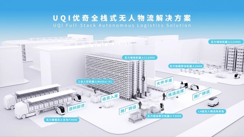 一個典型的生產物流場景貫穿了原材料卸貨、入庫、倉儲、分揀、出庫并配送至生產車間,加工成成品后,成品入庫、倉儲、分揀及出貨等多個場景,涵蓋了物料的存儲、分揀、搬運和配送四大功能。如何實現全流程無人化,尤其是各流程之間的自動化無縫銜接,一直是行業痛點。UQI優奇此次推出“硬件+軟件+服務+運營”的全棧式無人物流解決方案,具備AI賦能、真無人、高柔性三大特點,通過多模態大模型、視覺算法和語音技術等多種AI技術賦能,可一站式柔性調度多種設備及機器人的協同作業,快速實現物流場景布局調整、擴建、升級等需求,真正完成無人物流的閉環。