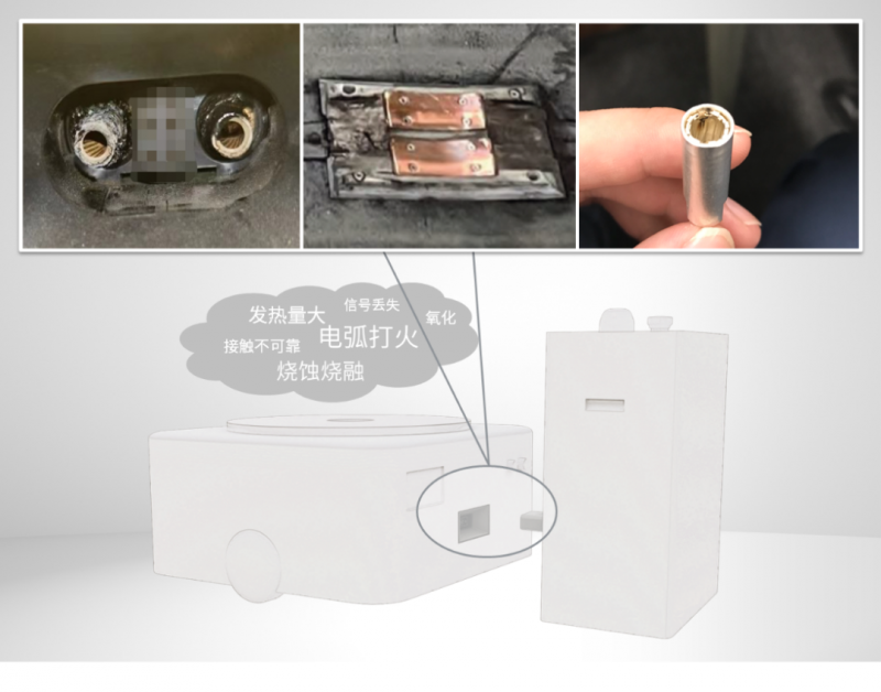 移動機器人頻繁充電時,若充電連接器無法適應高插拔工況,隨著插拔次數增加,連接器表面磨損加劇,鍍層和基材受損,接觸電阻上升。磨損到一定程度發生接觸失效,接觸電阻會急劇增大,引發高溫發熱,帶來電氣安全風險。