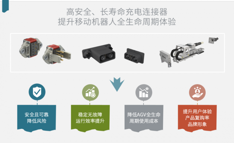 穩定可靠的充電連接器,能避免移動機器人充電故障,提高運行效率,降低維護成本,提升 ROI。同時,覆蓋全生命周期的充電連接器,TCO更低。