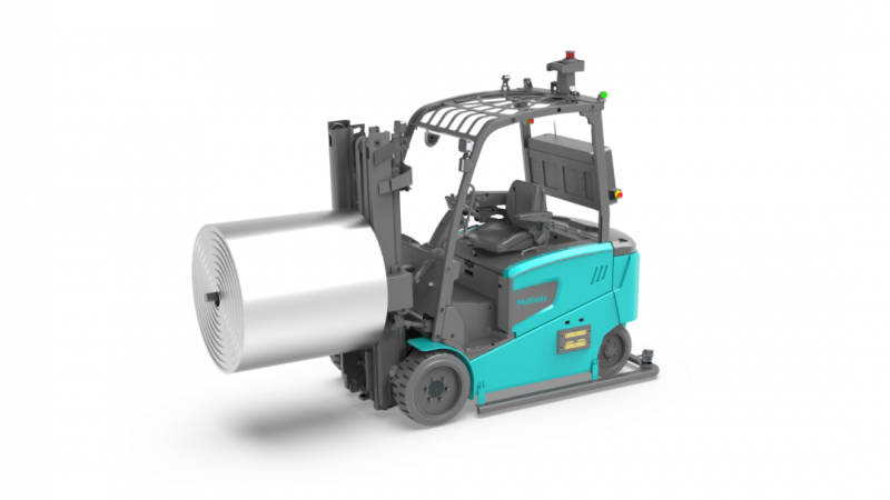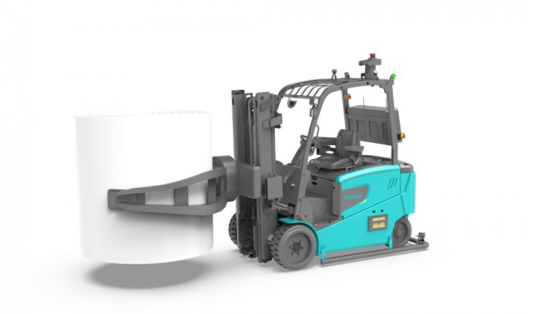 勱微E系列平衡重式無人叉車搭載弧形自適應(yīng)夾具,夾緊物料后可連續(xù)360°旋轉(zhuǎn),便于交換作業(yè),廣泛用于造紙、紙箱、包裝、印刷等行業(yè)無托盤搬運(yùn)。
