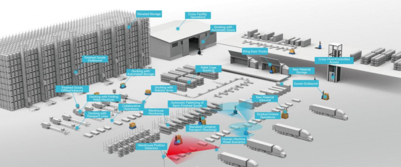 圍繞工廠 - 物流 - 倉(cāng)庫(kù)體系,鐳神智能針對(duì)不同企業(yè)室外和室內(nèi)不同場(chǎng)景的物料運(yùn)輸全流程,涵蓋從原材料到貨轉(zhuǎn)運(yùn)、車間生產(chǎn)物料精準(zhǔn)配送、成品下線搬運(yùn),直至出貨轉(zhuǎn)運(yùn)等各個(gè)環(huán)節(jié),提供智能搬運(yùn)解決方案。為客戶打造真正可落地的智能制造與智慧物流體系。