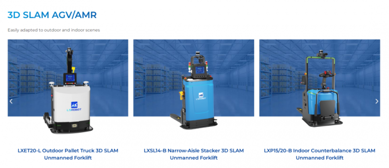 官網(wǎng)展示了涵蓋六大類型的3D SLAM無人叉車產(chǎn)品矩陣,包括托盤搬運(yùn)式、前移式、堆垛式、平衡重式、三向叉式AGV無人叉車和AMR移動(dòng)機(jī)器人產(chǎn)品系列。