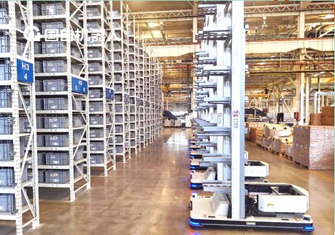 國自機(jī)器人采用大件、中件、小件、標(biāo)準(zhǔn)件四種物料分類方式,大、中件采用地堆庫、小件采用立體庫+部分地堆庫、標(biāo)準(zhǔn)件采用立體庫的存儲方案,通過多類型潛伏頂升式移動機(jī)器人ANTS、多層料箱揀選機(jī)器人PICKING及重載搬運(yùn)機(jī)器人,自動對接料架、托盤、料箱等多種載具。RCS調(diào)度系統(tǒng)通過算法優(yōu)化,實現(xiàn)全場多數(shù)量、多類型AGV互相協(xié)作、統(tǒng)籌調(diào)度,用多種叫料方式結(jié)合存儲與揀配策略,實現(xiàn)物料智能配送,全面提高全廠物流效率。