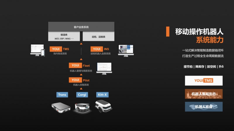 優(yōu)艾智合是國內(nèi)最早布局軟件系統(tǒng)的移動機器人企業(yè)。以針對制造業(yè)打造的YOUI TMS智慧物流系統(tǒng)為例,其能將移動機器人在工序間的物理流轉(zhuǎn)升級為數(shù)據(jù)連接,具備根據(jù)ERP、WMS、MES等企業(yè)信息系統(tǒng)進行整體物流自主調(diào)度的能力,完成備料倉到產(chǎn)線再至成品倉的物流數(shù)據(jù)全覆蓋。