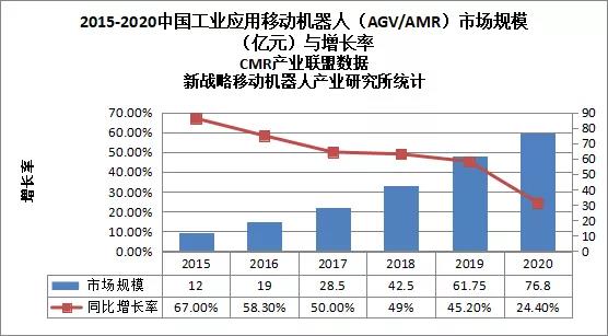 圖表:2015-2020中國工業(yè)應(yīng)用移動機(jī)器人(AGV/AMR)市場規(guī)模(億元)與增長率