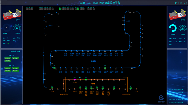 大挖工廠通過融入國自的超重載20噸AGV、30噸RGV車型,在柔性物流裝配線領(lǐng)域內(nèi)實(shí)現(xiàn)全局調(diào)度,完成了以下多個(gè)技術(shù)應(yīng)用的探索與突破: