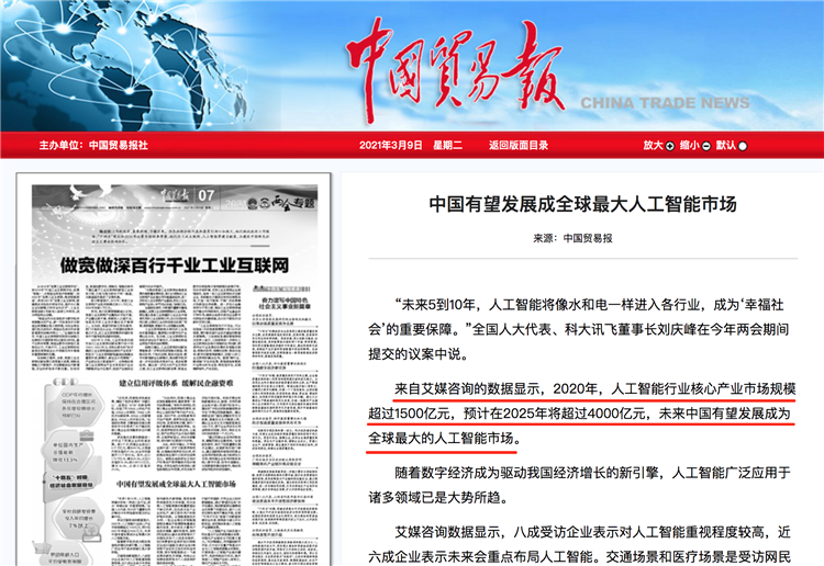 以人工智能為例,中國作為制造業(yè)大國,為其提供了豐富的應用場景。據(jù)艾媒咨詢數(shù)據(jù):2020年人工智能行業(yè)核心產業(yè)市場規(guī)模將超過1500億元,預計在2025年將超過4000億元,中國人工智能產業(yè)在各方的共同推動下進入爆發(fā)式增長階段,市場發(fā)展?jié)摿薮螅磥碇袊型l(fā)展為全球最大的人工智能市場。