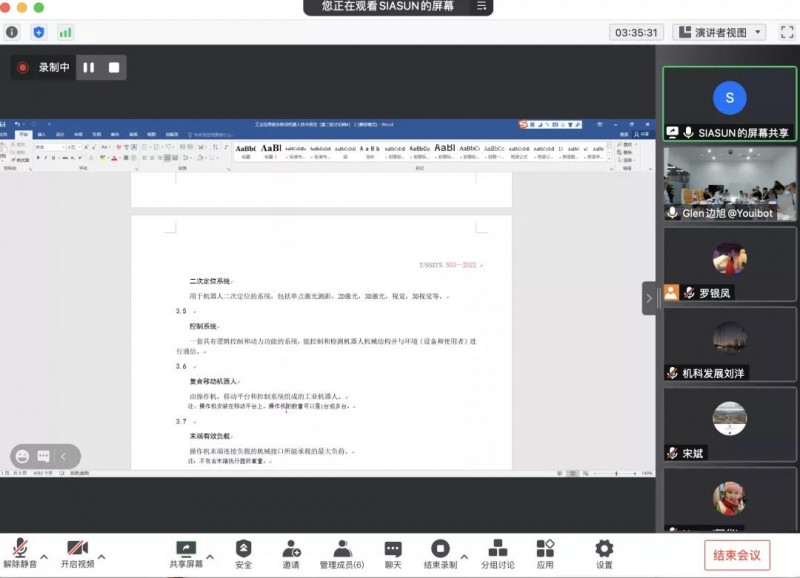 會議由該項標準牽頭單位-深圳優艾智合機器人有限公司技術總監邊旭及起草單位-新松機器人自動化股份有限公司技術總監助理謝巍主持,CMR產業聯盟秘書長李進科,CMR產業聯盟標委會副主任、新松機器人股份有限公司移動機器人BG技術總監高峰參與指導,各參與單位專家就《工業應用移動機器人 技術規范-復合機器人》團體標準核心技術內容進行了充分交流,并確定了修改意見。