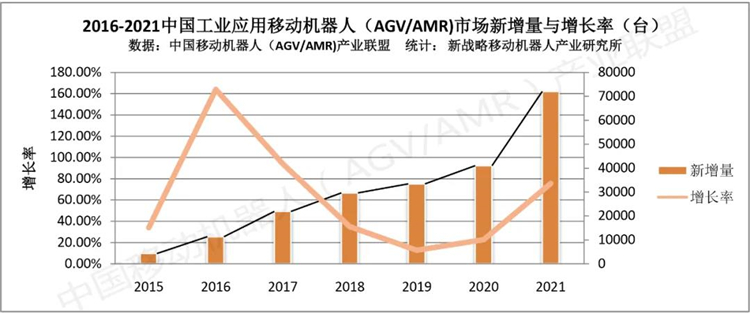 圖表:2016-2021中國(guó)市場(chǎng)工業(yè)應(yīng)用移動(dòng)機(jī)器人(AGV/AMR)新增量(臺(tái))與增長(zhǎng)率