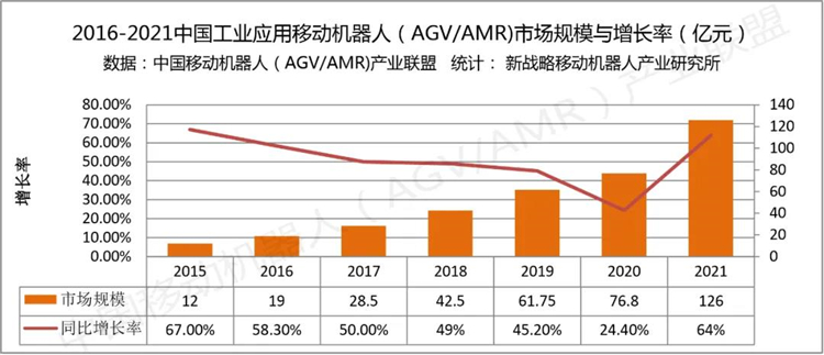 圖表:2016-2021中國(guó)工業(yè)應(yīng)用移動(dòng)機(jī)器人(AGV/AMR)市場(chǎng)規(guī)模(億元)與增長(zhǎng)率