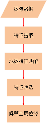 紋理導(dǎo)航算法首先對(duì)相機(jī)采集的圖像進(jìn)行視覺特征提取,這里的視覺特征主要指點(diǎn)、線及結(jié)構(gòu)特征等;然后,算法會(huì)將提取得到的特征與導(dǎo)航地圖庫中的特征進(jìn)行匹配、篩選,得到地圖庫中對(duì)應(yīng)的匹配特征,根據(jù)兩對(duì)特征的相互映射、轉(zhuǎn)換關(guān)系解算實(shí)時(shí)全局位姿,完成AGV設(shè)備的導(dǎo)航定位。