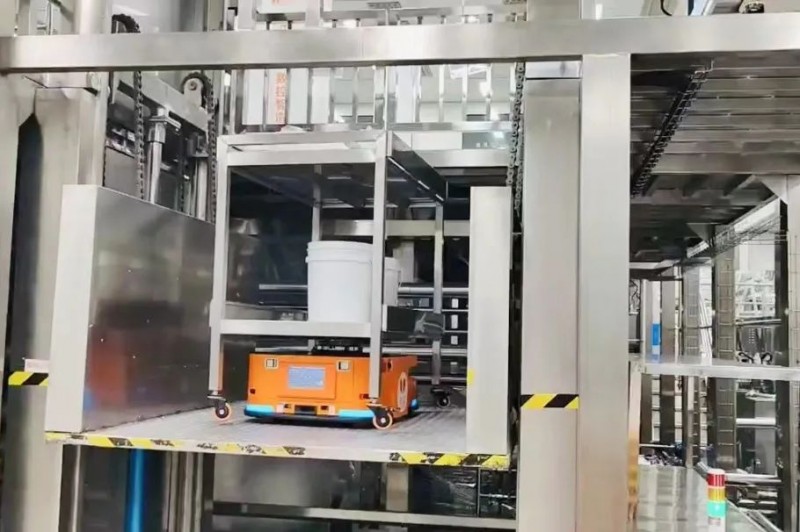 同時,由Gulf-1400-CDD無人叉車機器人負責原材料從原料倉到乳化車間的搬運、空桶的產(chǎn)線返回、半成品從產(chǎn)線到車間的中轉(zhuǎn)、包材的產(chǎn)線搬運,搭配FMS調(diào)度管理系統(tǒng),實現(xiàn)最優(yōu)任務(wù)分配方案,讓倉儲物流整體效能最大化。
